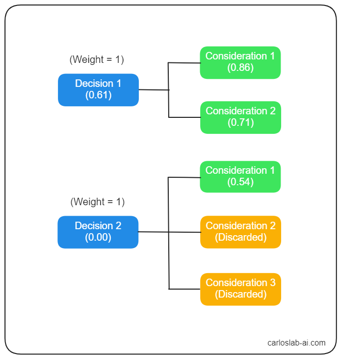 , Decision 2 realizes that it cannot beat Decision 1. Consequently, all lower considerations are discarded and the final score of Decision 2 is 0.00